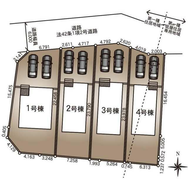 号棟番号:4号棟 総戸数:4戸 工事完了予定年月:2026年02月 4号棟 栃木市大平町西野田 第4 【法令】文化財保護法 景観法 宅地造成工事規制 区域【その他制限事項】第一種住居地域(建蔽率60%・容積率200%)を含むため土地全体の建蔽率は48.46%・容積率は119.27% 法第22条区域 絶対高さ制限10m 建物面積に別途ルーフバルコニー約4.86平米有 カースペース2台(車種による)